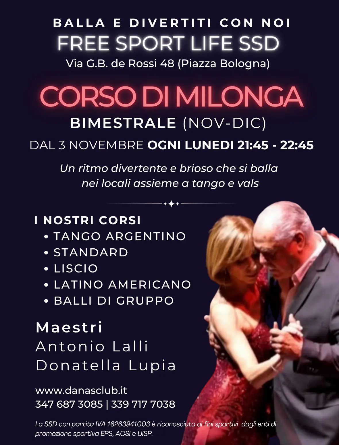 Corsi di tango argentino, balli di gruppo, liscio, standard, latino americano, coreografico per tutte le età e livelli. Gare e competizioni sportive.